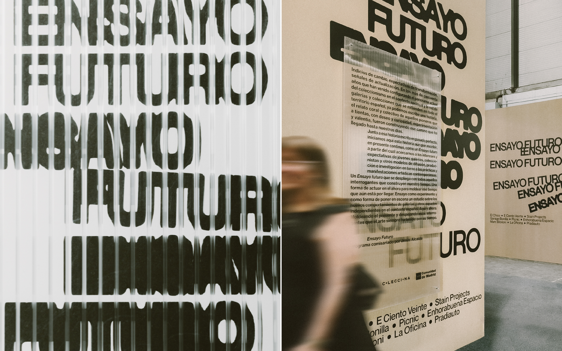 Ensayo Futuro es una sección de la feria de arte contemporáneo Estampa comisariada por Jesús Alcaide, centrada en galerías y proyectos emergentes. Se plantea como un espacio atento a los indicios de cambio y a las transformaciones del arte contemporáneo, desde los interrogantes que definen el presente. Propone así una forma de actuar en el ahora para modelar lo que está por venir, mostrando nuevos comportamientos de galerías jóvenes en España. La identidad parte del descubrimiento en el proceso: ritmos que se repiten y se interrumpen, ensayos que integran el error y capas que generan nuevas lecturas. Un lenguaje visual en movimiento, abierto a la experimentación.